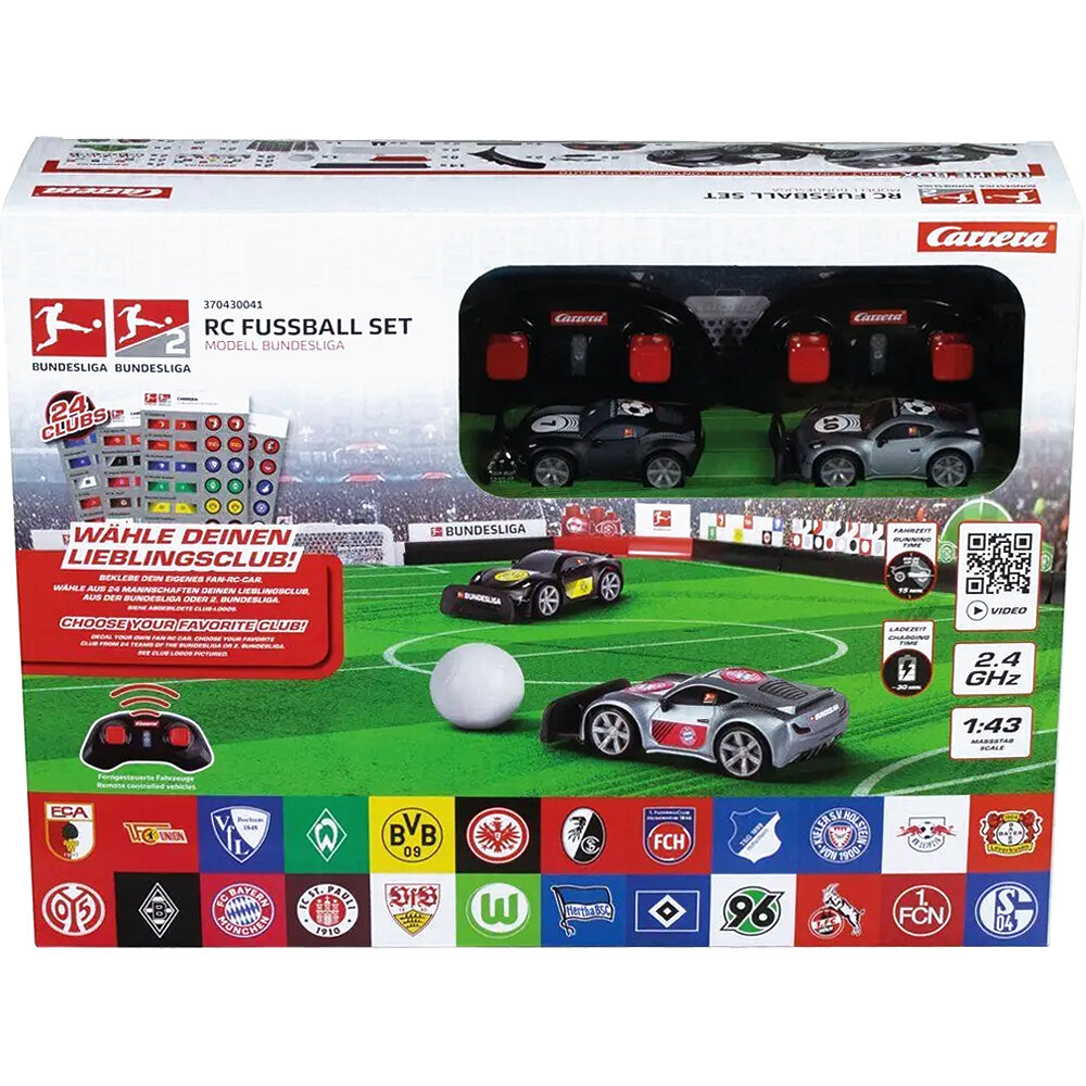 Mit dem RC Fußball Set Modell Bundesliga, wird Rennaction und Torjubel vereint. Fans fühlen sich wie mitten auf dem Feld, wenn sie sich mit den 22 Bandenelementen ihr eigenes Fußballfeld bauen. Außerd em enthält das Set auch einen Ball, zwei Tore und natürlich zwei 2,4GHz Bundesliga™ Mini RC Fahrzeug e in schwarz und grau sowie Controller. Die beiden Fahrzeuge können dank Original-Bundesliga-Lizenz mit Stickern von 24 Clubs dekoriert werden, so dass direkt klar wird, für welchen Verein das Herz der jungen Fans schlägt. Mit der Profi- oder Beginnerschaufel gilt es nun, den Ball geschickt ins Tor zu bugsieren - und sich die Spitze der Fußball-Tabelle zu sichern!