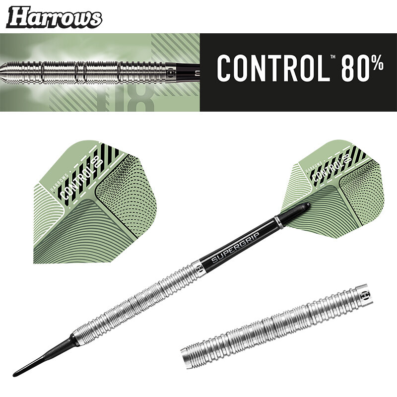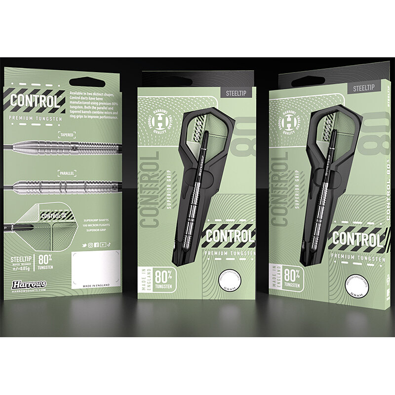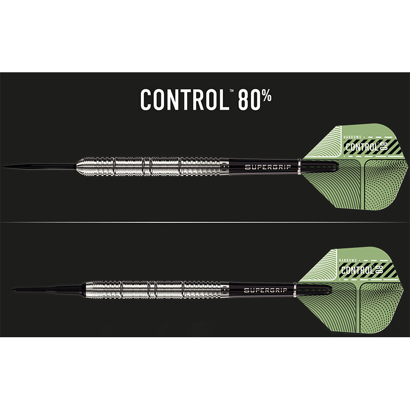 Harrows Control Parallel 80% Darts werden mit Schwarz/Silber Intermediate Supergrip Shafts, und neuen Harrows Control Flights geliefert und haben ein Match Gewicht von +/- 0,05 Gramm.