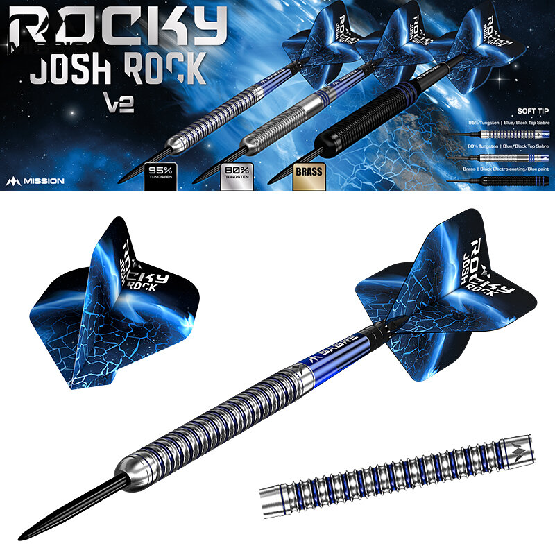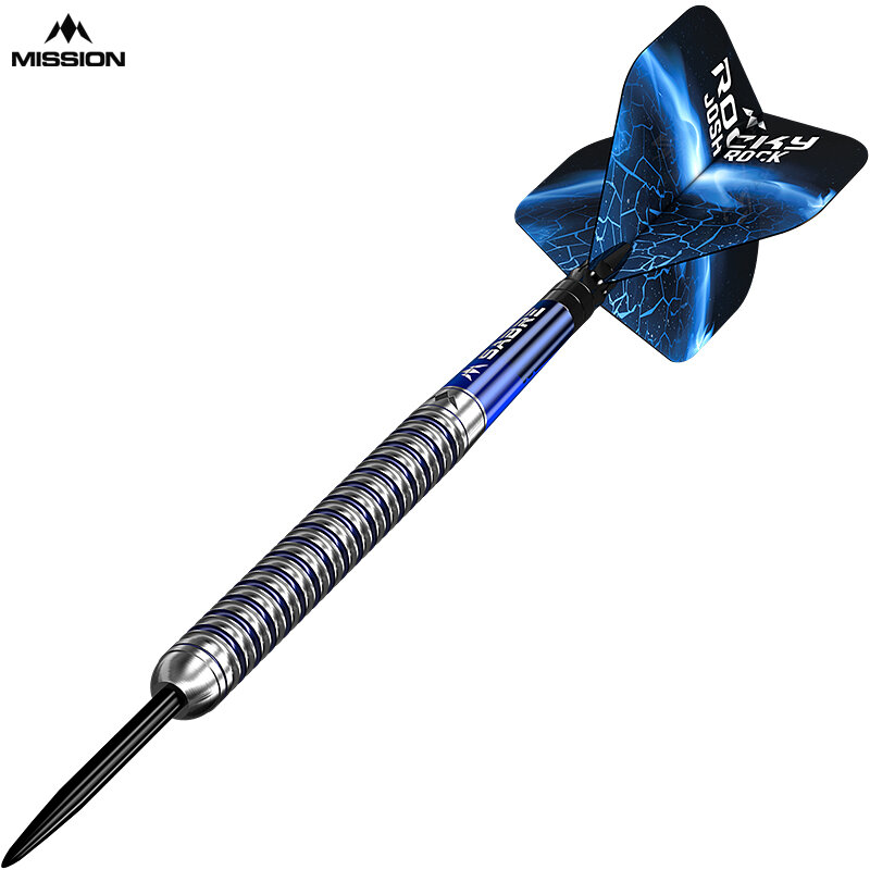 Der neue Mission Josh Rock Rocky Silver & Blue 95% Tungsten Dart wird mit Mission Dart Sabre Shafts Short Blau, Mission Josh Rock Rocky Dart-Flight Nr. 2 und Standard Steel-Points 26 mm vervollständigt.