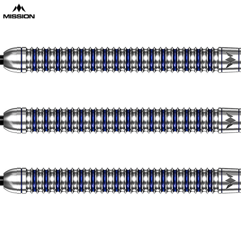 Diese Darts mit Ringdesign und blauen Ringen, bestehen aus 95 % Tungsten und verfügen über das per Laser in die Rückseite des Barrels eingraviertem Mission-Logo.