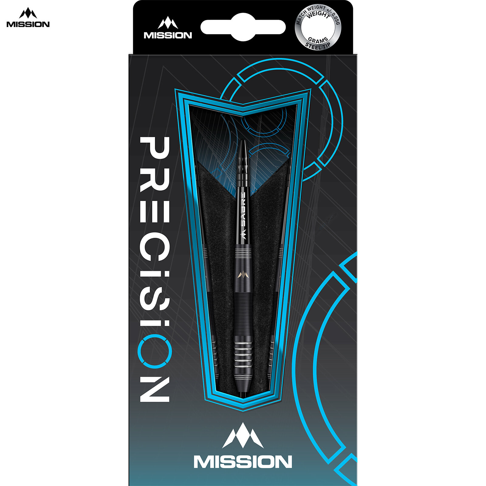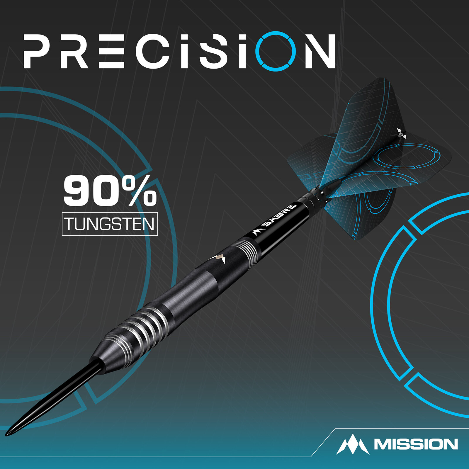 Der neue Mission Precision Dart wird mit Mission Dart Sabre Black Shafts mit Aluminium-Top Short Schwarz, Mission Precision Dart-Flight Nr. 2 und Standard Steel-Points 26 mm vervollständigt.