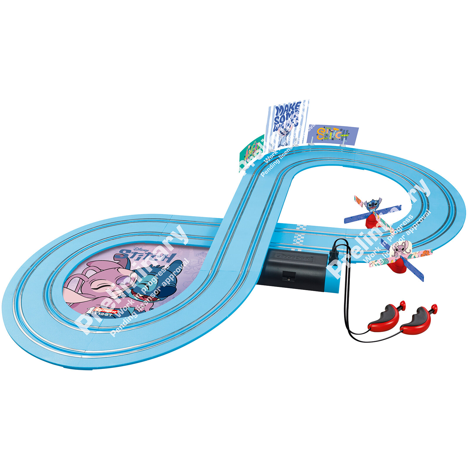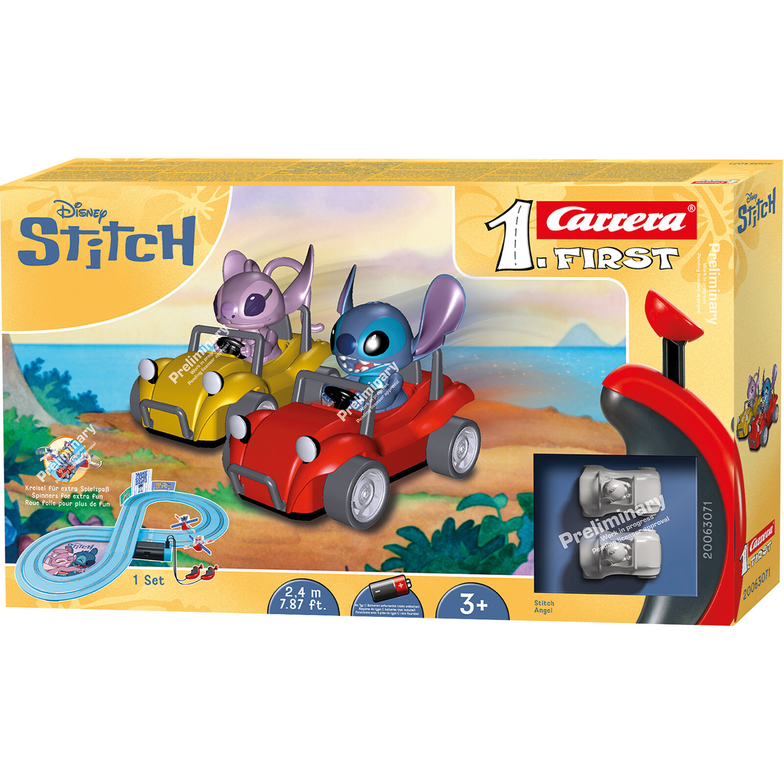 Das Carrera FIRST Disney Stitch Set bringt Rennspaß auf eine 2,4-Meter-Bahn. Stitch und Angel liefer n sich in 1:50 Fahrzeugen spannende Duelle. Die elektronischen Handregler sind ideal für kleine Hände, und der Kreisel sorgt für zusätzlichen Spaß. Blaue Schienen und Disney-Dekorationen aus dem Lilo & Stitch Film machen jedes Rennen zu einem fröhlichen Abenteuer für Kinder ab 3 Jahren.