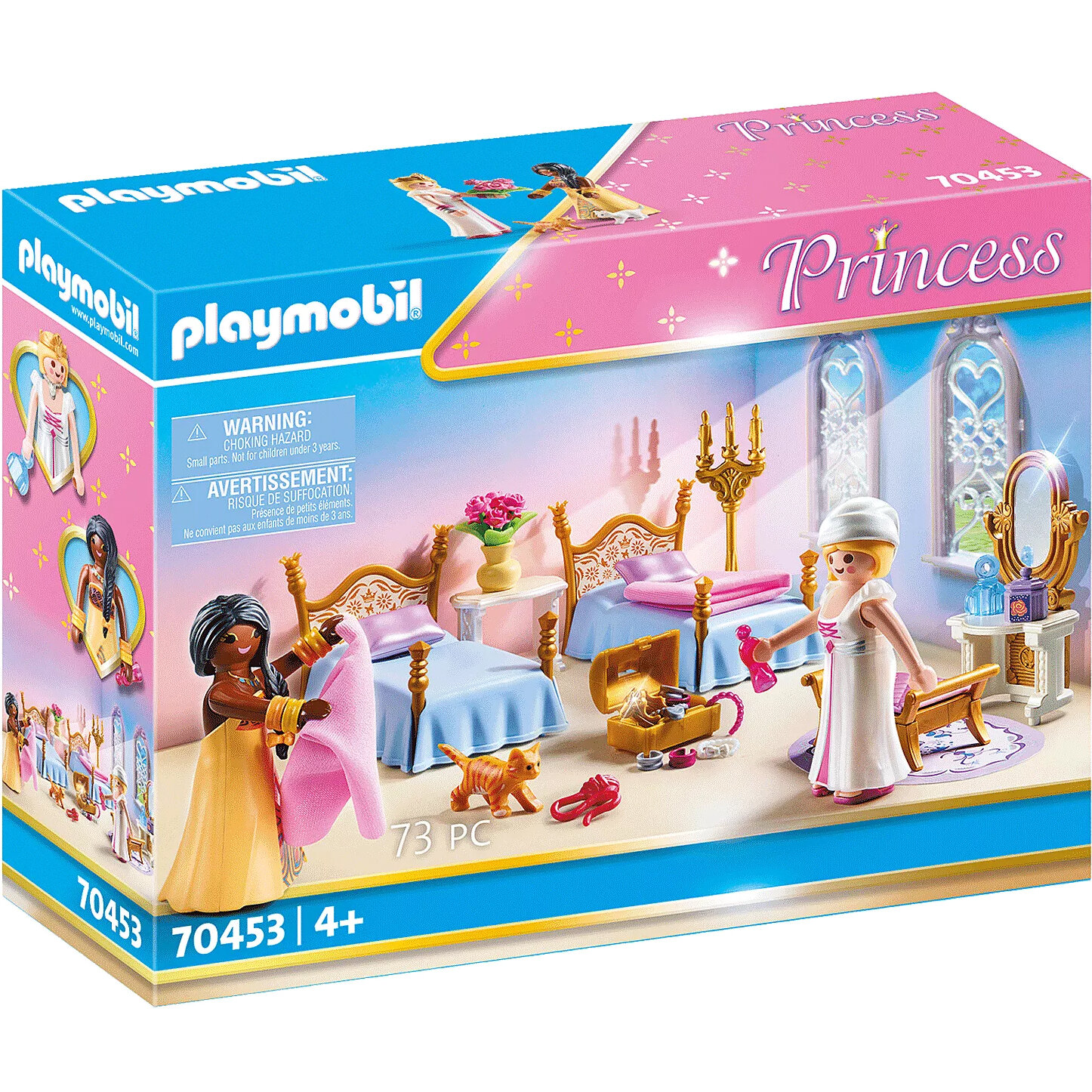 Im PLAYMOBIL Princess Schlafsaal (Artikelnummer 70453) finden Prinzessinnen alles für eine erholsame Nacht im Schloss. Nach einem aufregenden Tag kuscheln sich die beiden PLAYMOBIL-Prinzessinnen in ihre gemütlichen Betten. Mit Schminktisch, Schmucktruhe und niedlichen Katzenbabys ist dieser Schlafsaal liebevoll eingerichtet. Ideal für Kinder ab 4 Jahren, die königliche Abenteuer und süße Träume erleben möchten. Ein zauberhaftes Set, das zum Spielen und Entspannen einlädt.