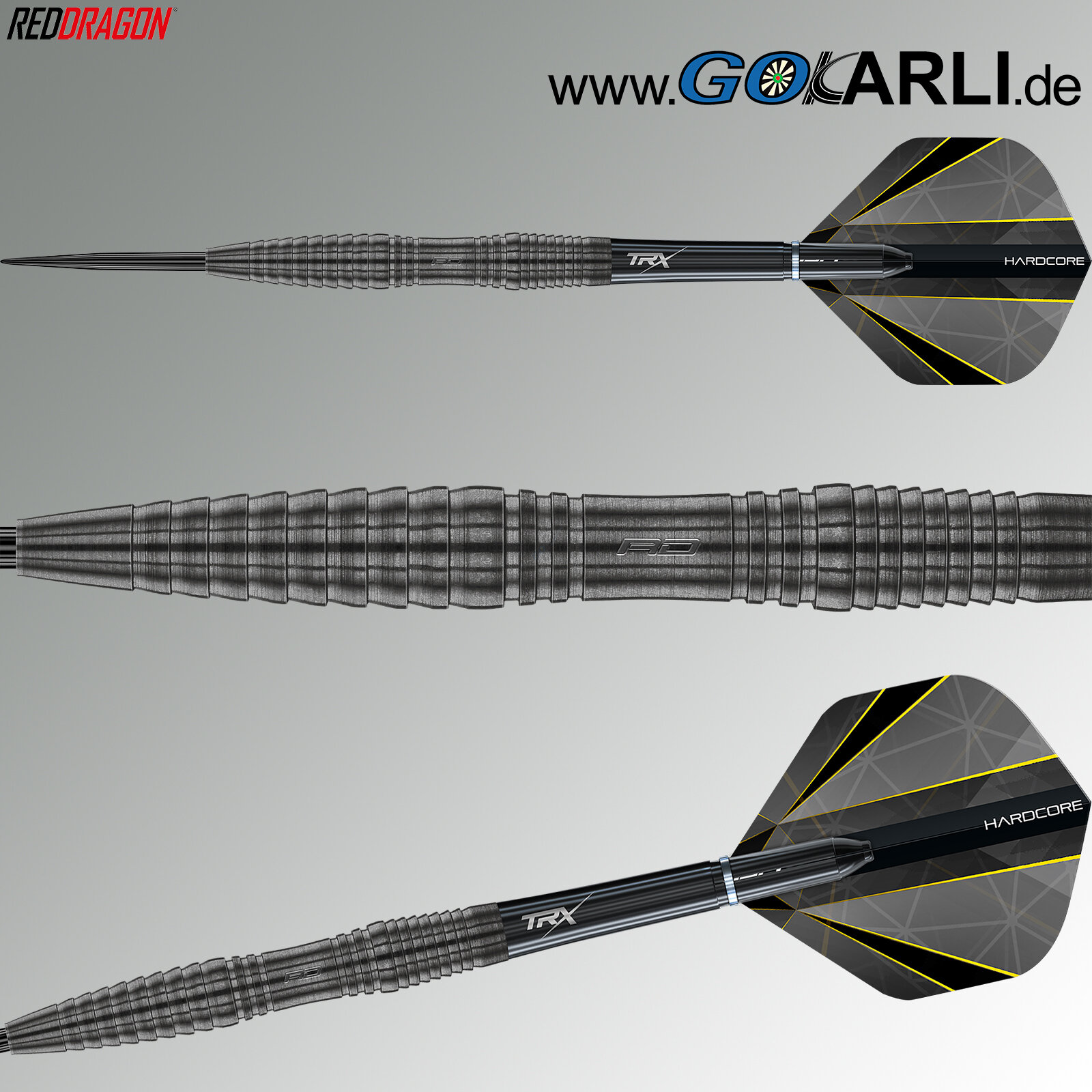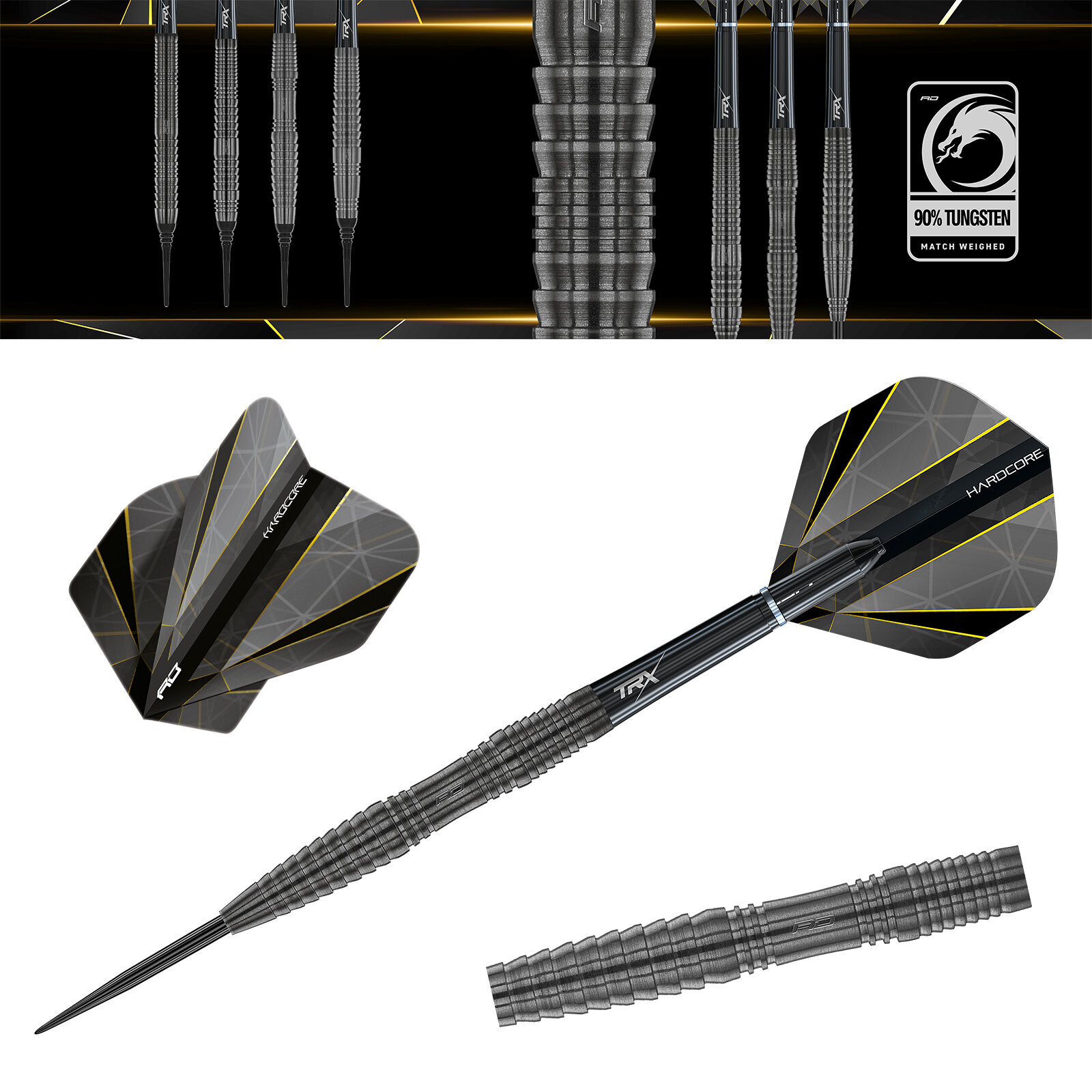 - Das 90% Tungsten Barrel mit Red Dragon Logo beschichtet mit Shadow Black-Finish