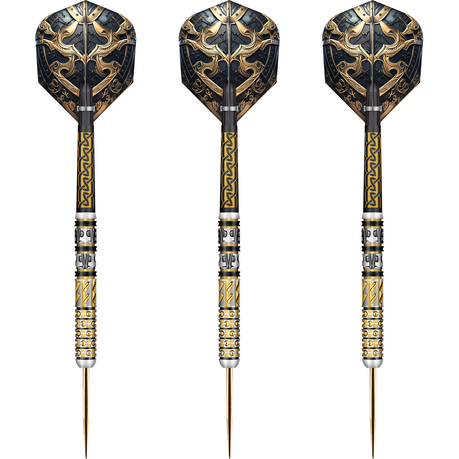 Vollendet wird der Dartpfeil mit einer goldenen Shot Stahl Spitze, KOI Carbon Helioknot Gold Intermediate IM Shafts und Viking Odin Flights, Flightform / Shape: Standard Nr.6.