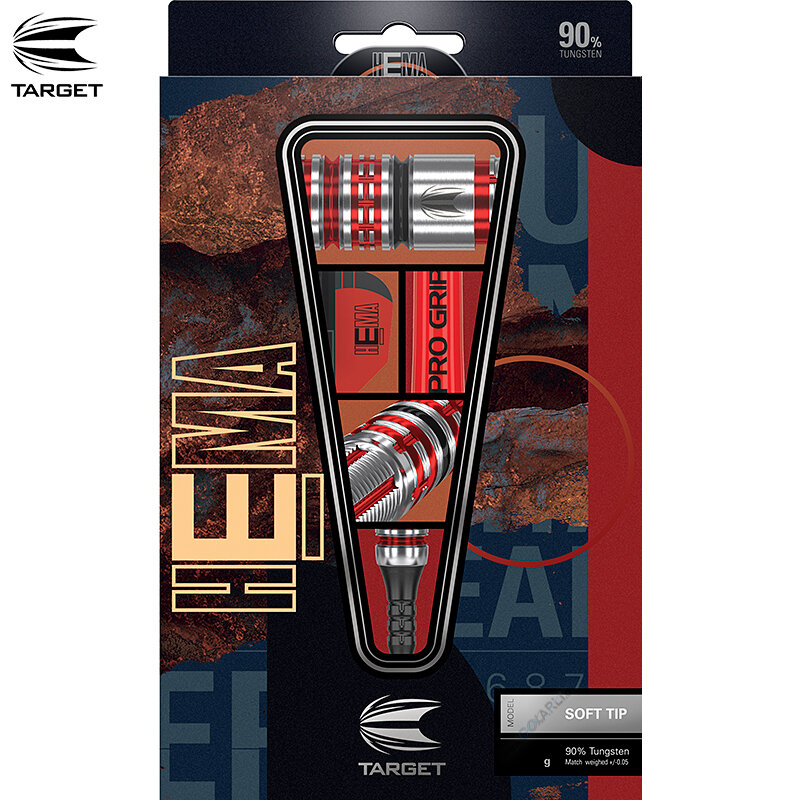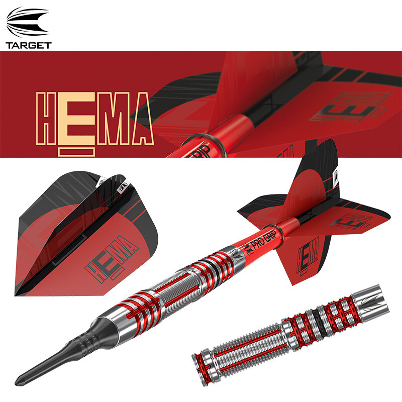 Die HEMA Soft-Point Serie wird mit Target Pro Grip Shafts Short in Rot, HEMA PRO Ultra Signature Flights und Target Pixeltip Softdart- Spitze Schwarz vervollständigt.