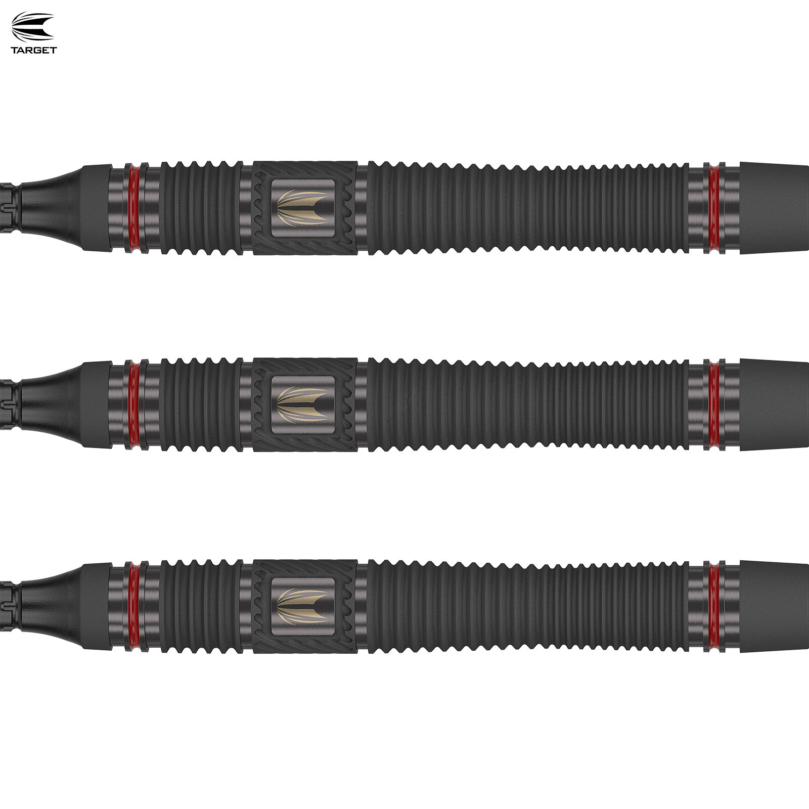 - Das schlanke gerade 90% Tungsten Barrel wurde schwarz PVD beschichtet und für das edle Aussehen mit roten Ringen versehen