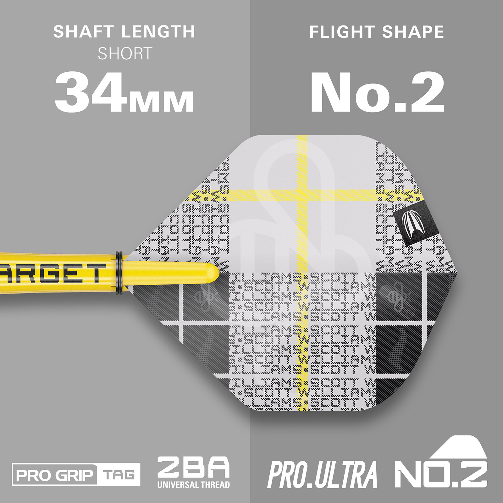 Ergänzt wird das Set durch Pro Grip TAG-Schäfte in leuchtendem Gelb, gepaart mit maßgeschneiderten Scott Williams Generation 2 Pro Ultra No.2 Flights. Mit seinem charakteristischen Branding und einem unverwechselbaren schwarz-grau-gelben Karomuster spiegeln die Flights Scotts unverwechselbare Bühnenpräsenz und Persönlichkeit wider.