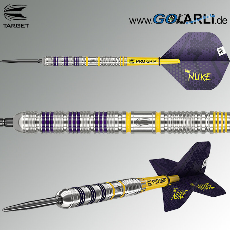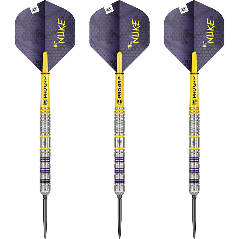 Vollendet wird das Luke Littler Loadout 90%Barrel mit Lila-Gelben Ringen. Komplettiert wird der Dart mit einem Pro Grip Shaft Short in gelb, einer SWISS Smooth Point 26 mm Black und Luke Littler The Nuke G1 2023 Pro.Ultra Nr.2 Flights