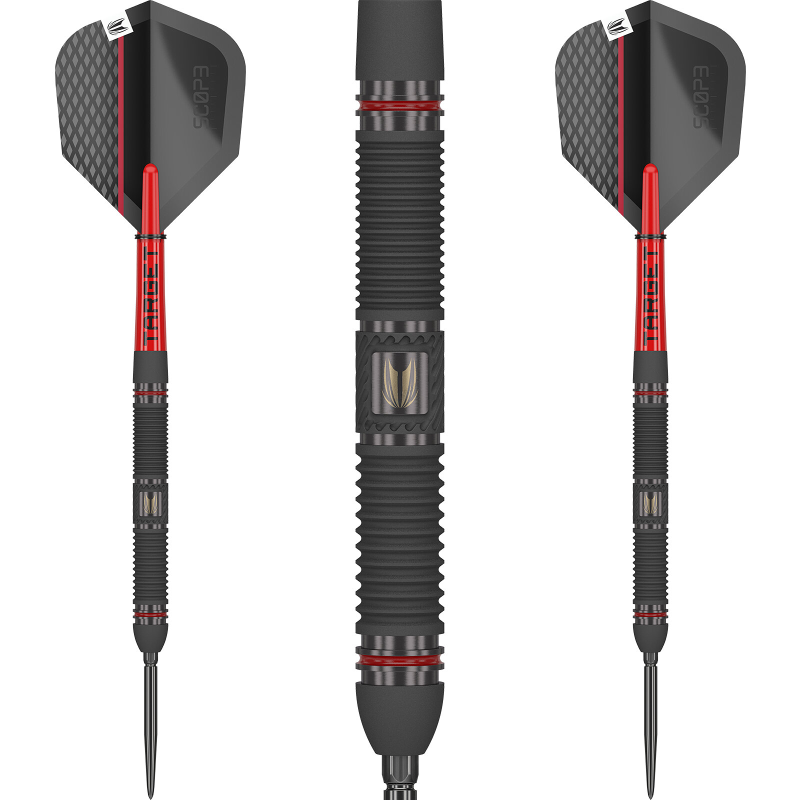 Das gerade Barrel des Scope 01-Darts besteht zu 90 % aus Tungsten und ist fachmännisch mit radialen Rillen an der Vorderseite und Nano-Rillen an der Rückseite gefräst, die den Fingergriff des Darts verbessern. Das Barrel wird dann sandgestrahlt und mit einer glatten schwarzen PVD-Beschichtung für verbesserte Haltbarkeit und ein raffiniertes mattes Finish behandelt, mit roten Ringen, die dem Barrel einen Farbtupfer verleihen.
