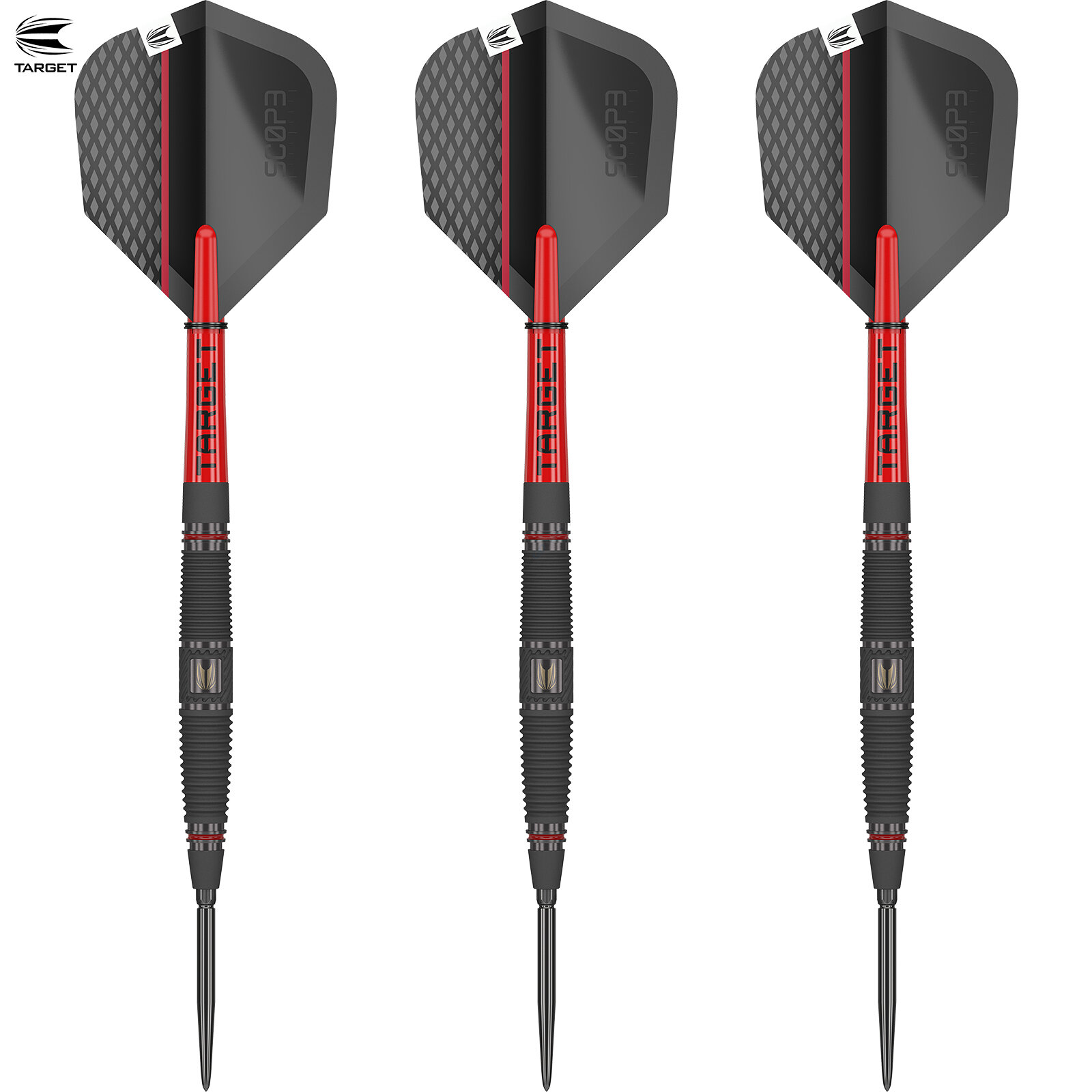Das nach vorne und hinten konisch zulaufende Scope 04-Dart-Barrel besteht zu 90 % aus Tungsten. Präzise gefräste radiale Rillen an der Vorderseite und Nano-Rillen an der Rückseite sorgen für besseren Fingergriff und bessere Kontrolle. Der Schaft wird anschließend sandgestrahlt und mit einer glatten schwarzen PVD-Beschichtung versehen, die eine überragende Haltbarkeit und ein raffiniertes mattes Finish bietet. Das Design wird durch rote Flecken ergänzt, die einen auffälligen Farbtupfer liefern, der die Optik des Schafts aufwertet
