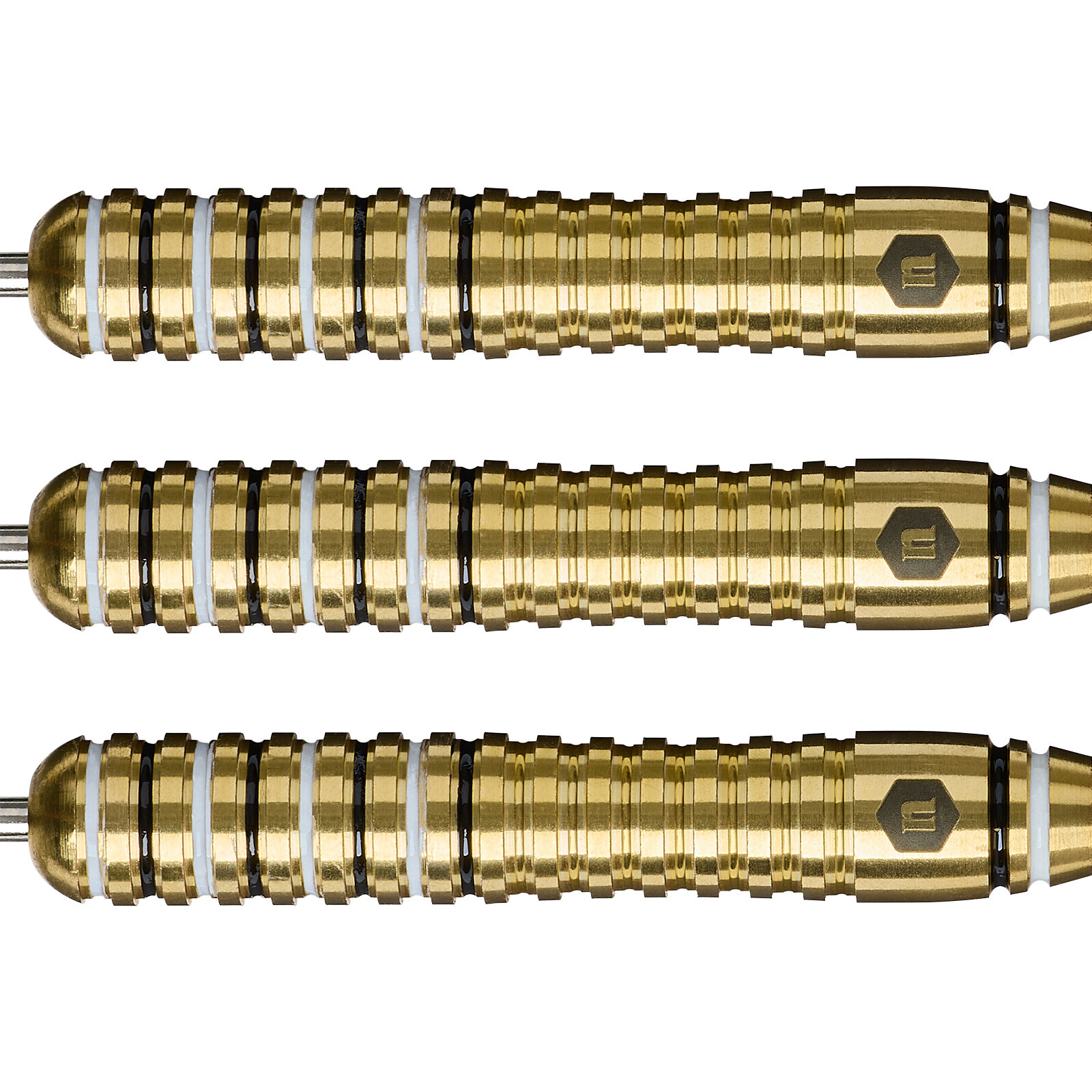 - Die Callan Rydz Brass Dartbarrels sind mit schwarz/weißen Ringen beschichtet