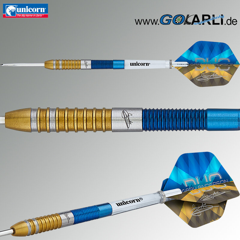 - Die Gary Anderson Duo 2-Tone 2023 Dartbarrels sind mit Blau / Gold Titanium beschichtet