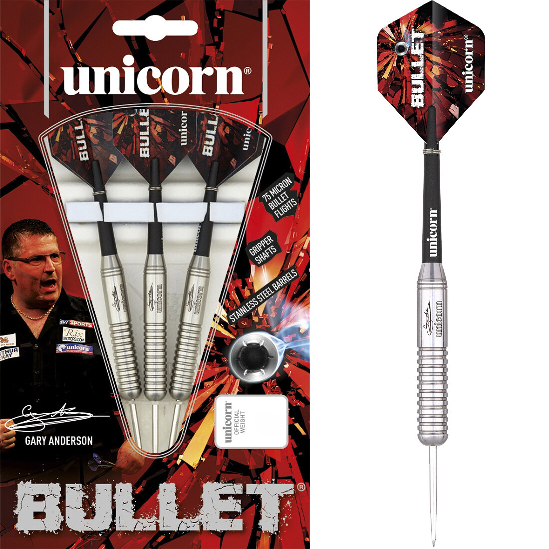 - Die Gary Anderson P2 Stainless Steel Dartbarrels sind mit der Spieler Signatur und dem unicorn Logo graviert