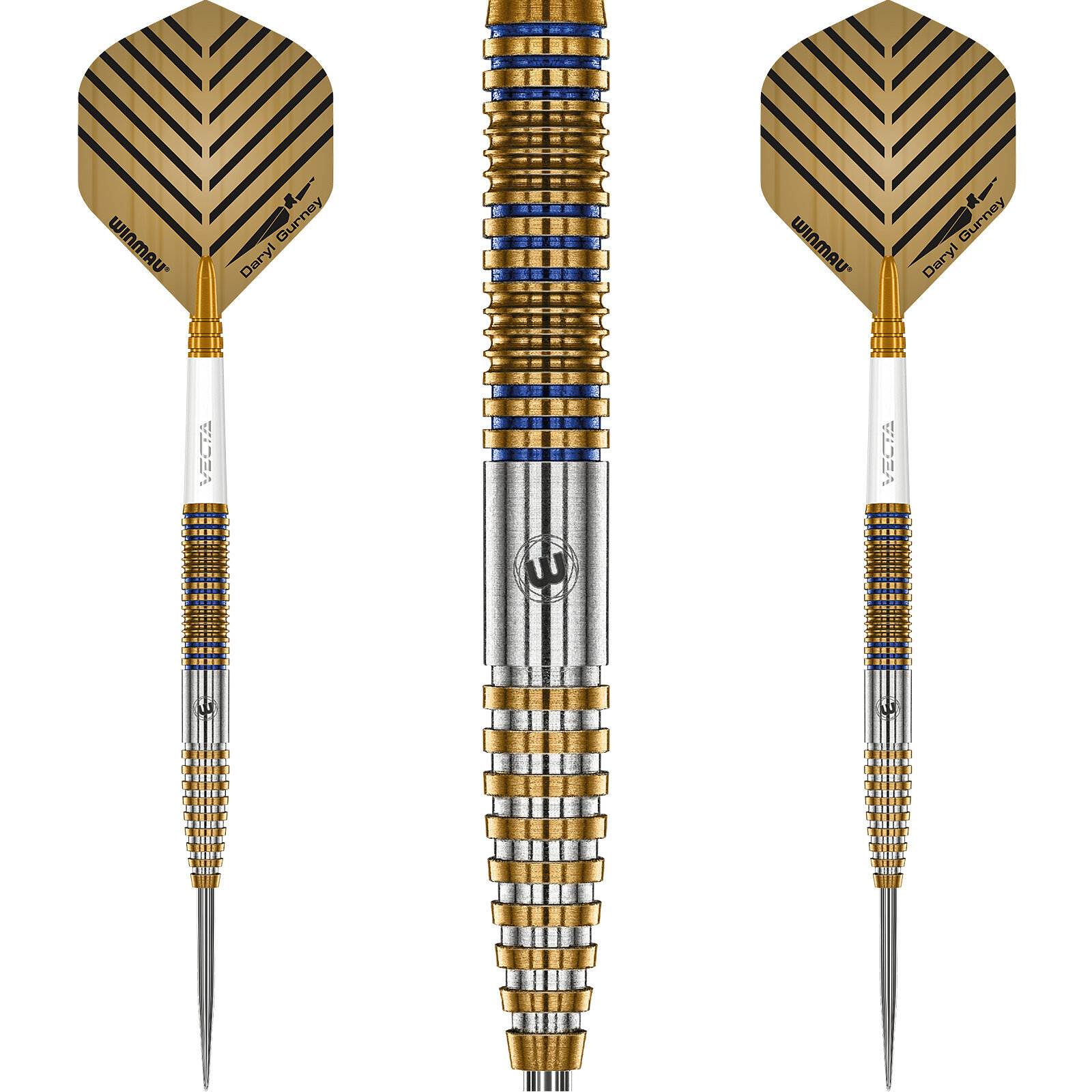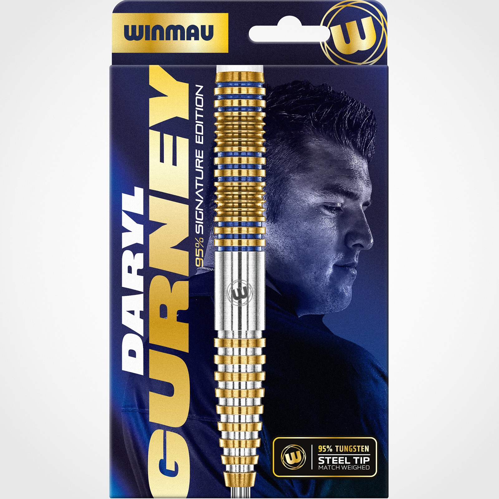- Das schlanke Winmau Daryl Gurney Signature Edition Barrel wurde mit Gold/Blau Nitrid-Beschichtung überzogen