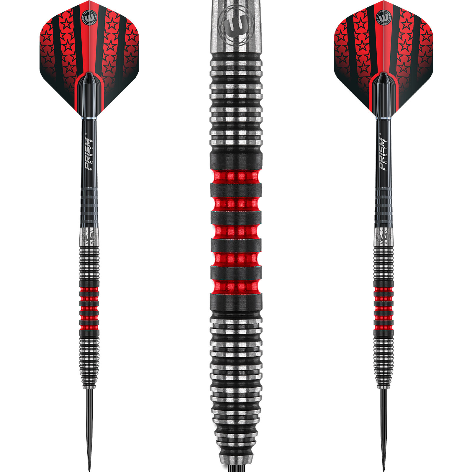 - Das gerade Barrel wurde mit drei Grip-Zonen ausgestattet, einem Winmau Präzisions Mill-Grip und mit Roten Ringen beschichtet
